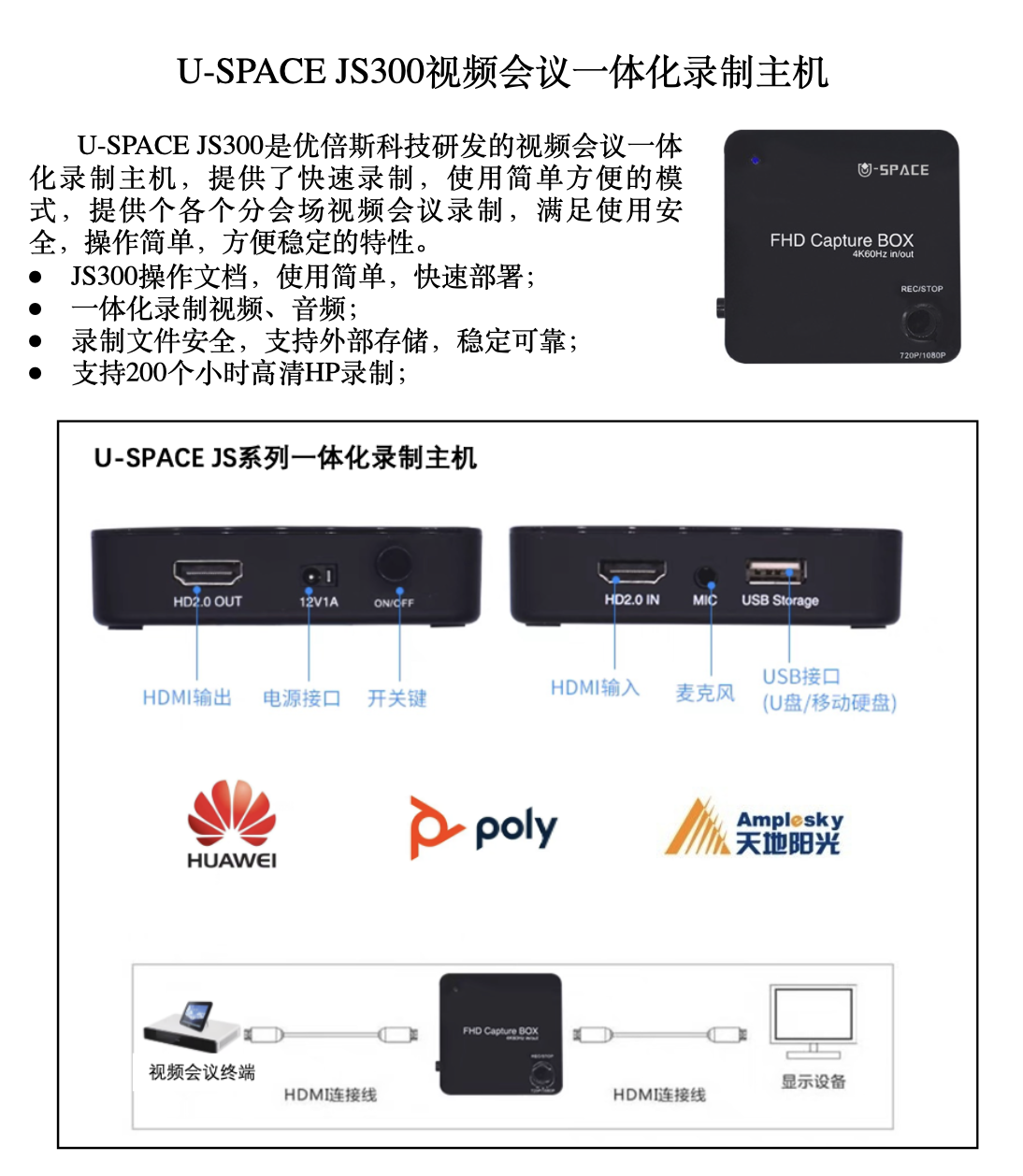 U-SPACE JS300是优倍斯科技研发的视频会议一体化录制主机,提供了快速录制,使用简单方便的模式,提供个各个分会场视频会议录制,满足使用安全,操作简单,方便稳定的特性。